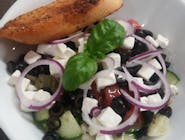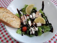 10 szt. krewetek królewskich podawanych na sałacie lodowej polanych kremem balsamicznym serwowane z pieczywem czosnkowym -