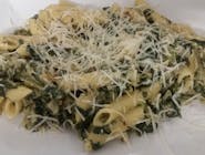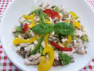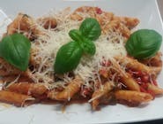 Makaron penne w sosie śmietanowym z kurczakiem, pieczarkami, brokułami, doprawiony ziołami i parmezanem -